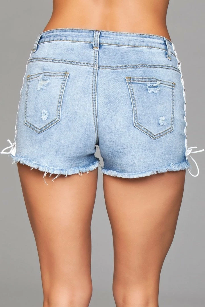 Light wash denim shorts with lace up side details and distressed details on front and back – button and zipper.