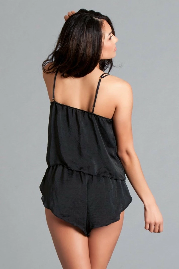 Cami and short set loose lightweight material high cut sided shorts double strap cami top deep V-neckline with guipure lace edging and corset front.