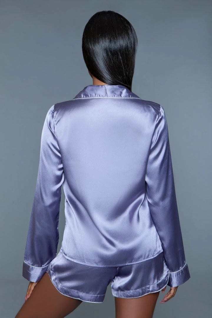 2 pc satin pajama set. Long sleeves top and shorts with silver piping.