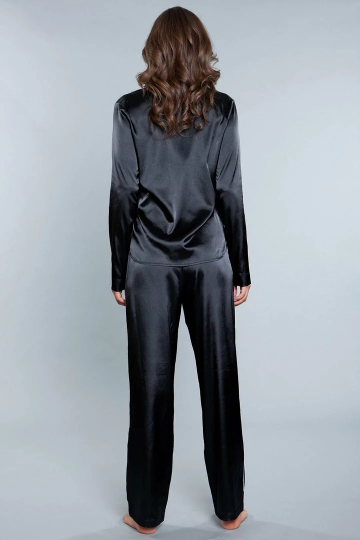 2 Piece. Long-sleeve Satin set with button-down top white piping detail and drawstring waistband pants. Wash separately/ machine wash cold tumble dry low/ cool iron/ do not dry clean. 97% Polyester 3% Elastane.Â