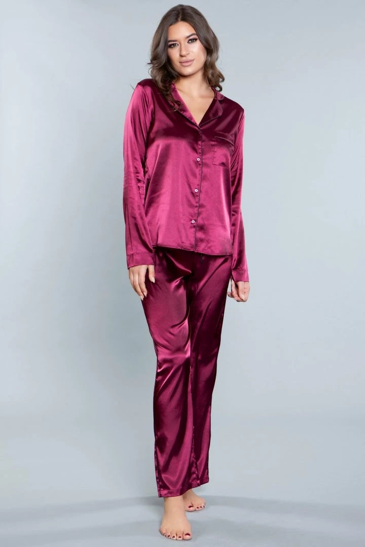 2 Piece. Long sleeve Satin set with button down top white piping detail and drawstring waistband pants. Wash separately/ machine was cold tumble dry low/ cool iron/ do not dry clean. 97% Polyester 3% Elastane.Â