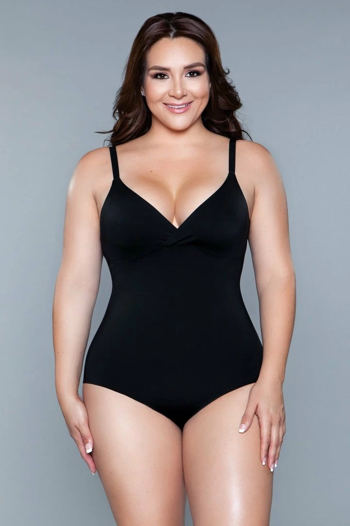 Black seamless bodysuit body shaper with adjustable straps and snap bottom closure.Â