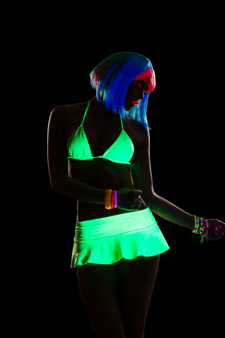 Exciting essential meets beautiful basic in an unstoppable combination of sultry style and sensational sex appeal. You’re sure to love our wet look ruffle skirt, and this fundamental accessory is sure to become your sexy standby for every ensemble. Featuring a figure flattering low rise wide waistband with attached discreet pleat flowing a line construction. Perfect for dressing up our tie front top or pairing with your next stage costume. Black light reflective. Skirt lenght is 7.5 inches. Includes 1 piece (tops sold separately).
