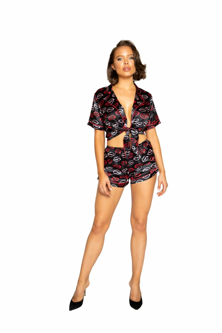 Chic 2 Piece Satin Pajama Set with Collared Tie Top and Full Short Bottoms Adorned with a Lip Print
