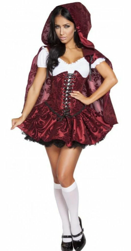 Includes Cape with Hood, Blouse, lace-up Waist Cincher, and Flared Skirt.