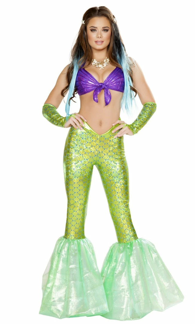 Includes Haltered Tie Top with Sea Shell Look, and High Pants with Zip-up Back Closure and Iridescent Mermaid Tail